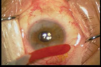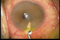 Figure 2. A slight peaking of the pupil is observed as a fluoroscein strip is applied to test the integrity of the incision. This effect alerted the surgeon to the possibility of vitreous strands incarcerated in the wound. |