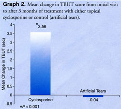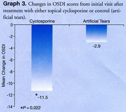 Moreover, cyclosporine provided significantly greater improvement in OSDI scores than did artificial tears (mean reduction of 11.5 + 8.8 with cyclosporine vs. a mean decrease of 2.9 + 11.6 with tears, P=0.022).