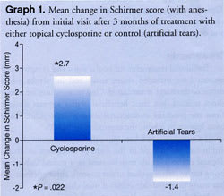 Topical cyclosporine (Restasis, Allergan Inc., Irvine, Calif.) has been shown to increase tear production and improve the quality of naturally produced tears and is the first approved therapeutic agent for the treatment of chronic dry eye.6 Topical cyclosporine has also been shown to significantly suppress the number of activated T lymphocytes within the conjunctiva, reducing the ocular inflammatory response.6