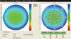 The Visante OCT maps corneal thickness in 25 spots across the cornea and has great repeatability (Figure 1). It can also create a differential map to compare past readings and detect subtle changes involved in corneal-thinning conditions. This can be very useful in following a patient with keratoconus or pellucid marginal degeneration (Figures 2a-b).