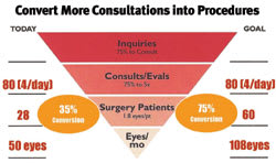 When I ask a lens surgeon how many people he or she has seen in the last month who were diagnosed with a cataract and scheduled to surgery, the answer is always 90% to 95%. However, when I perform the math, the story is quite different. An insurance-based cataract surgeon performing 50 surgeries per month tells me he sees 40 patients per day on average. Review of his appointment calendar confirms the 40 daily appointments and indicates that 10 of these patients each day are potential lens surgeries either cataract evaluations referred in from optometrists, cataract rechecks from within his own practice or people over the age of 50 who present for an annual exam with symptoms of glare consistent with a cataract. Ten patients per day equals 40 per week (assuming 4 clinic days per week.) That potential is 80 lens surgeries per week, or 360 per month. Yet the surgeon is performing 50. Rather than 90% conversion, my experience is that general ophthalmology practices convert no more than 20% of patients to surgery. Patients may tell the surgeon they will schedule, but then back out with the surgery scheduler, cancel after returning home, don't pass medical clearance or opt-out because they don't have the funds.