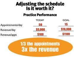 When I suggest this idea, I immediately hear from surgeons and administrators that this is impossible. There is no way they can consolidate all lens consults onto 1 day. (Conversely, the most successful LASIK practices routinely block and group their LASIK consults so they are not interrupted with dissimilar patients.) The prevailing general ophthalmology view is that 15 patients can never make up for the 50 they usually see. I hear, "This will financially cripple us." This thinking demonstrates a poor grasp of the financial leverage of appointment targeting within a practice.