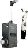 The Perkins Hand-Held Applanation Tonometer is portable, making it easier to examine bedridden and pediatric patients. Based on Goldmann principles and utilizing the original Goldmann or Tonosafe-disposable prisms, the Perkins combines proven technology with the flexibility of a handheld instrument. The Goldmann Applanation tonometer is on the left side of the figure and the the Perkins Tonometer appears on the right.