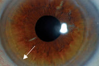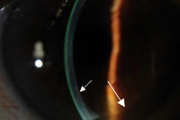 Full illumination (top) and slit beam (bottom) photos of a DSEK eye 3 months after surgery. The full illumination image indicates the graft clarity and absence of any sutures. The large arrows indicate the edge of the graft. The slit beam illuminates the donor tissue behind the recipient cornea, and the small arrow indicates the interface between the donor and recipient. |