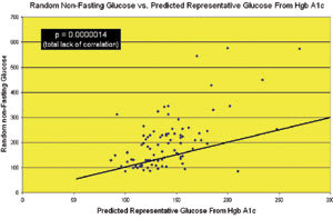 The graph in this figure shows a statistically significant lack of correlation between random non-fasting glucose levels vs.predicted representative glucose from HgbA1c. |