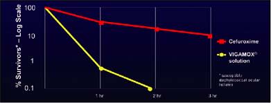 Figure 3. In susceptible staphylococcal ocular isolates, moxifloxacin 50 µm/mL killed more than three logs in 2 hours, while cefuroxime 100 µg/mL or 1,000 µg/ killed less than 1 log in 3 hours.