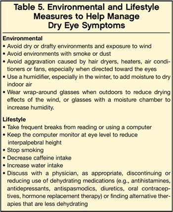 ■ Patient education, environmental and lifestyle management. Dry eye is best managed through a combination of patient education, environmental control and lifestyle modification (Table 5), and appropriate therapies. Patients should be educated about dry eye and, based on their history, made aware of any of the patient-related, environmental, and disease-related factors that cause or contribute specifically to their condition. It is also important that the patient understands dry eye requires long-term management, and that he or she needs realistic treatment expectations.
