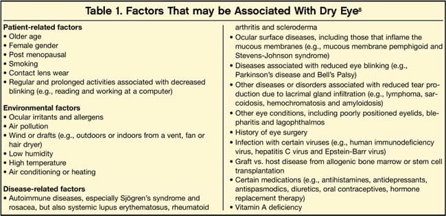 Dry eye is the result of insufficient tear production, excessive tear evaporation and/or abnormal tear composition. It can be sporadic; for example, occurring after exposure to hot, dry or windy environments; or it can be chronic as a result of ocular abnormalities. Whichever the case, dry eye can be associated with any of various patient-, environment-, and disease-related factors (Tables 1 and 2), according to the American Academy of Ophthalmology Cornea/External Disease Panel.8