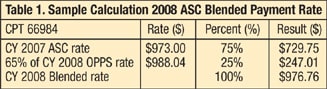 As with most dramatic regulatory changes, there is a phase-in period; this one will take 4 years. In 2008, ASC payments will be a 75/25 blend of the 2007 ASC payment rate and the new rate determined under the revised payment methodology. In 2009, a 50/50 blend applies; in 2010, a 25/75 blend applies; in 2011, the new payment system will be fully implemented. Table 1 illustrates how the blend calculation works for cataract surgery with implantation of an IOL in 2008.