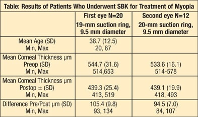 The 20-mm ring with a 120-μm Zyoptix XP head had been shown to accurately produce a 120-μm flap.7 Thus, we expected that a 19-mm ring and the 120-μm head would produce a thinner flap. And, just as we thought, and as the data in the Table shows, we were able to consistently get flaps very close to 100-μm with that combination.