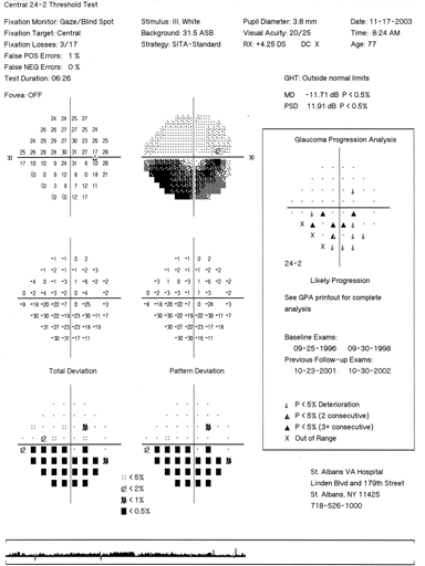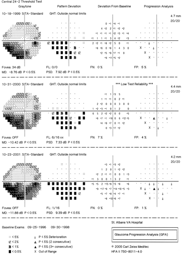 perimeter) that detects genuine glaucoma progression, comparing recent
