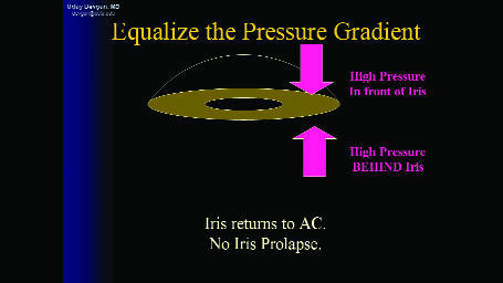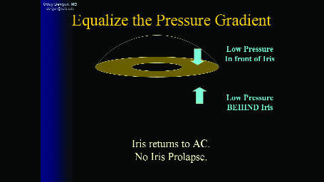 Figures 2a-c. Iris prolapse is caused by a pressure gradient, with high pressure behind the iris and low pressure in front of it (2a). This pressure gradient can be equalized by lowering the pressure behind the iris (2b), or by increasing the pressure in front of the iris (2c).