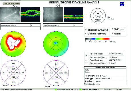Figure 1. At presentation, patient�s best-corrected visual acuity was 20/60 OD and foveal thickness was 715 �57 �m OD.