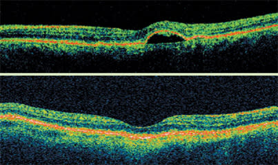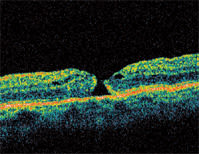 The Stratus OCT is useful in staging macular holes. For example, stage 1 holes are not full-thickness and usually resolve on their own. A hole that is not full-thickness but has an opening in it is a stage 2 hole. At this stage, treatment is generally peeling of the hyaloid with gas bubble.