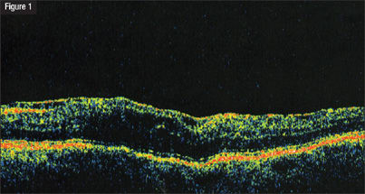 To confirm my suspicions, I used the Stratus OCT to examine the patient's retina in the left eye. Results showed that she had an ERM with foveal traction and an internal limiting membrane (ILM) (Figure 1).