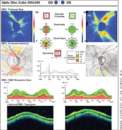Early diagnosis begins with a complete history and ophthalmic examination, including gonioscopy to examine the angle structures, Dr. Rhee says. If glaucoma is suspected, he recommends obtaining central corneal thickness, achromatic automated visual field test and optic nerve imaging with photos to monitor the patient over time. The Heidelberg Retinal Tomograph (Heidelberg Engineering, Vista, Calif.), optical coherence tomography (OCT), such as with the Cirrus HD-OCT (Carl Zeiss Meditec, Dublin, Calif.) (Figure 2), and the GDx nerve fiber analyzer (Carl Zeiss Meditec) also may detect glaucoma before change is observed on the visual field, he says. In addition, the Retinal Thickness Analyzer (RTA, Marco, Jacksonville) may work for this application. Frequency-doubling perimetry and SITA-SWAP (Carl Zeiss Meditec) have been shown to be able to detect visual field changes before automated achromatic field testing, Dr. Rhee says. "I utilize both the SWAP and the anatomic imaging in early suspected cases to try to see if they have detectable damage that isn't seen on the automated achromatic, white on white."