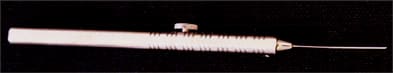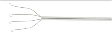 When the button on the side of the instrument is lowered, four very thin wires exit the instrument (Figures 2, 3) in a radially expanding manner. This provides a plane, rather than a single rod, on which to support the lens fragment(s). Additional features of the design include a broad spoon- or bowl-shaped configuration, as well as a small upturn at the end of the wires. This upturn both protects the retina from the edge of the wires if it is inadvertently touched, and acts like a "claw" to hold onto the lens fragments. The thinness of the wires minimizes the surface area that can place traction on the vitreous gel.