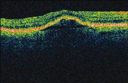 I found the test to be reliable based on indices of false negative and false positive results. After a follow-up OCT confirmed the presence of a pigment epithelial detachment (PED) (Figure 2), I discussed with the patient treatment versus observation. Since PEDs are unpredictable and may be stable for a long time, we elected to watch for now. Upon her return visit after 1 month, her vision had dropped from 20/40 to 20/80 and repeat OCT revealed a larger PED (Figure 3). At that time we instituted Lucentis for the right eye as well. Thus far, she has had a total of seven Lucentis injections, two pegaptanib (Macugen, OSI Pharmaceuticals) injections, one PDT, and two Avastin (Genentech) injections. As of July 2008, the date of her last injection, her vision was stable at 20/60. I believe the information generated by the Foresee PHP saved her sight by picking up her lesion much earlier, allowing me to treat promptly.