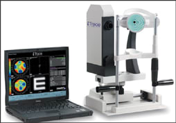 ■ The iTrace Visual Function Analyzer is a combination autorefractor, corneal topographer, wavefront aberrometer, autokeratometer and pupillometer. The iTrace utilizes ray-tracing wavefront aberrometry, capturing 256 data points sequentially in less than 400 milliseconds. By projecting thin-beam laser points into the pupil and charting the retinal location of each data point, the wavefront sensor can calculate the precise amount of deviation induced in the optical system.