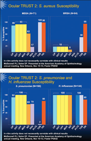 Figures 1 and 2 show that newer generation fluoroquinolones have similar susceptibility patterns in vitro, according to the Ocular Trust 2 database.