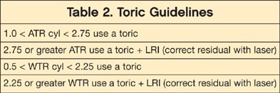 My patients' experience with the AcrySof Toric IOL can only be termed as a "wow." In my practice, results have been superior to the other methods of astigmatic correction I use. In an evaluation of our first 100 cases, the average preop astigmatism was 1.78 D, while the postoperative cylinder was 0.26 D. Patients are often amazed at, and appreciative of, the clarity of their distance vision. Table 2 contains my selection criteria for use of the lens.