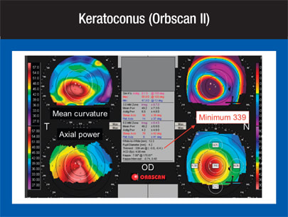 We're accustomed to using corneal topography and slit-scanning technology to monitor keratoconus patients. Slit-scanning technology, such as the Orbscan (Bausch & Lomb, Rochester, NY), provides a pachymetry map. But the Orbscan tends to underestimate corneal thickness in the setting of even mild corneal haze and scar, including keratoconus. Errors in the Orbscan pachymetry map can be significant when determining if a keratoconus patient is a candidate for corneal implants.