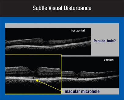 Figure 5. A small area of the perifoveal scotoma looks like a pseudo-hole, but a closer look with the RTVue-100 reveals the micro-hole and disruption of the outer part of the retina.