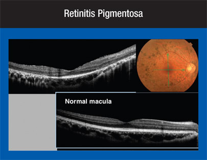 Retinitis pigmentosa is shown in Figure 7. The RTVue-100 clearly shows the outer part of the retina, revealing that most of the outer retina is gone.