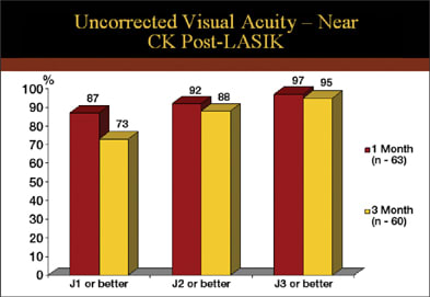 We demonstrated in a multicenter prospective study on 150 post-LASIK emmetropic presbyopic eyes receiving an 8-spot CK at an 8-mm optical zone that more than 95% read at J3 or better at 1 month and 3 months (Figure 3).1