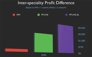 At the Spectra Eye Institute, we compared the two most common vitreoretinal surgical codes (pars plana vitrectomy with membrane stripping and pars plana vitrectomy with membrane stripping and endolaser photocoagulation), with cataract surgery, aqueous shunt surgery and penetrating keratoplasty. Due to the immediate effect of the vitreoretinal codes and without a blend-in period compared to the other ophthalmic codes, the increased reimbursement from 2007 to 2008 is significant: Cataract surgery with intraocular lens implantation, +1%; aqueous shunt, -43%; penetrating keratoplasty, +13%; pars plana vitrectomy with membrane stripping, +54%; pars plana vitrectomy with membrane stripping and endolaser photocoagulation, +36%. (It should be noted that the aqueous shunt is not currently reimbursed in the new CMS regulation. However, OOSS and the ophthalmology community are lobbying CMS heavily to change this unintentional consequence within the next year). When these changes in ASC reimbursement are converted to dollar payment increases, results are equally impressive: cataract with intraocular lens implantation, +$12; aqueous shunt, -$542; penetrating keratoplasty, +$150; pars plana vitrectomy with membrane stripping, +$841; pars plana vitrectomy with membrane stripping and endolaser photocoagulation, +$774.