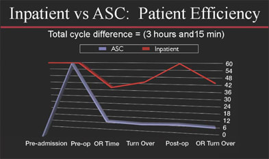 Over 80% of all vitreoretinal surgeries are currently done in an in-patient hospital setting. Spectra evaluated the time efficiency of an in-patient unit versus an ASC from a patient point-of-view. We reviewed over 100 charts and documented the time required of the patient for pre-admission testing, preop, OR time, turnover and postop. We then tabulated this data and evaluated the median time in each facility. Our studies showed that on average, the patient spent 3 hours and 15 minutes longer in the hospital than in the ASC (Figure 2).