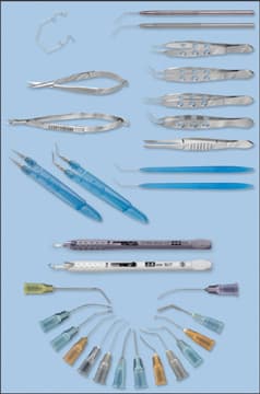 BD Visitec single-use instruments include: Bonn forceps, capsulorrhexis forceps, Macpherson forceps, eye speculum, needle holder, Vannas scissors, Westcott scissors, Buratto's hook, Sinskey hook and the straight micromanipulator.