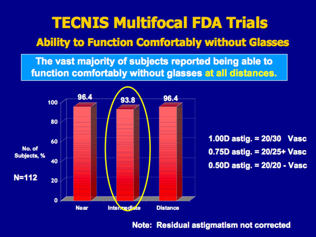 Figure 2. Study results presented to the FDA showed that a high percentage of patients, all of whom had received bilateral implantations of Tecnis Multifocal IOLs, reported that they were able to function comfortably without eyeglasses at all distances.
