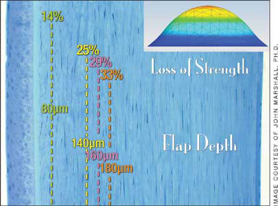 Studies by John Marshall, Ph.D., of King's College, University of London, showed that the corneal biomechanics of LASIK procedures done with thinner flaps (around 100 μm in depth) looked as good as those of PRK cases. His work demonstrated that a thinner flap would be better for the cornea in the long-term because it involves the cutting of fewer fibers and nerves (Figure 1).