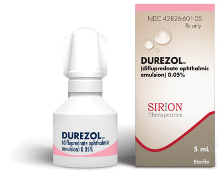 The two phase 3 trials submitted as part of the approval were identical in design and had similar results. Both trials included two Durezol treatment arms — one Q.I.D. and one B.I.D., and two placebo arms dosed in the same fashion. Patients in the trial included those undergoing ocular surgery and presenting with more than 10 cells in the anterior chamber 1 day after surgery. No NSAIDs were allowed in the trial.