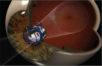 Under evaluation are Implantable Miniature Telescope (IMT) prostheses (VisionCare Ophthalmic Technologies) for patients with bilateral end-stage AMD that magnify the retinal image sufficiently to minimize the scotoma and project the image extrafoveally over a relatively wide 52-degree diameter of the central and peripheral retina (Figure 4).11