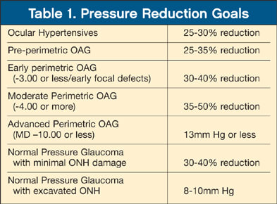 A traditional approach in glaucoma has been to treat the patient with a moderate IOP reduction, and then add a second drop if there is progression in the visual field or further cupping. I try to be a little more aggressive with my target pressures in hopes of preventing (or at least delaying) progression and the need for additional therapies. I recommend being proactive by using target pressures based upon the randomized clinical trials or other sources (such as the Delphi group or Table 1) rather than waiting for either structural or functional evidence of disease progression. OM