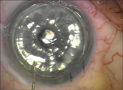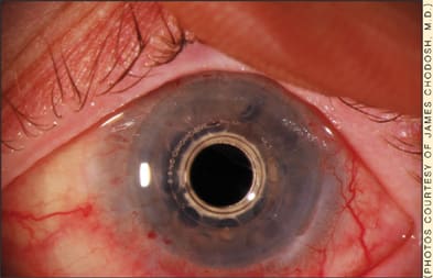 After one or two failed corneal transplants using human tissue the odds of a successful tissue transplant grow longer. At that point, surgeons will consider implanting an artificial cornea (keratoprothesis). The two FDA-approved artificial corneas are the (Dohlman-Doane) Boston KPro, developed by Claes Dohlman, M.D., and initially approved in 1992, and the AlphaCor (Addition Technology), which was approved in 2002. Because of its high retention rate without complication, onestage implantation procedure (vs. two-stage for AlphaCor) and reports of superior visual outcomes, the Boston KPro has become the artificial cornea of choice for the large majority of U.S. corneal transplant surgeons. Surgeon preference for the KPro has been evidenced in the number of implantations of the two devices, journal articles and by a show of hands at the recent ASCRS meeting. However, there are some cases in which surgeons may choose to implant an AlphaCor. For example, Dr. Gorovoy anecdotally reports success in using the AlphaCor creatively in a less-invasive, single-stage procedure in which vision was improved for a young woman from counting fingers to approximately 20/200. James Chodosh, M.D., of Cambridge, Mass., has recently taken over much of the work for advancing the Boston KPro. "The Boston KPro is the most popular artificial cornea in the United States and in the world with more than 900 implanted worldwide in the past year," says Dr. Chodosh. "Its primary use is following corneal graft failure. Very few third attempts at transplant last. The KPro is also indicated for aniridia and corneal damage due to infection, injury or neovascularization. The KPro may not be the best choice if the patient has an autoimmune disease such as Stevens-Johnson Syndrome or severe dry eye." Dr. Chodosh says that almost all KPro recipients must wear a bandage-type soft contact lens as long as the implant is in the eye to avoid dehydration. "Glaucoma is an issue," says Dr. Chodosh. "Once the KPro is implanted, we can only test for glaucoma using finger tension. In addition, we cannot put the KPro into phakic patients. The implantation procedure must be accompanied by cataract surgery." Dr. Chodosh says the use of the antibiotic vancomycin has enabled KPro implantation with low infection risk.