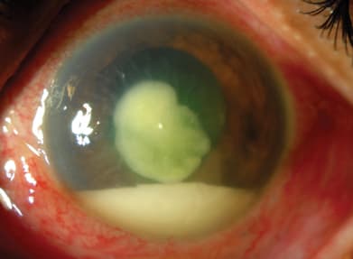 A patient with a severe central bacterial ulcer and a large hypopyon. Image courtesy of Christopher Rapuano, M.D.