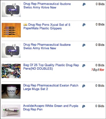| At right: Drug sales reps quickly flooded eBay with listings of promotional items suddenly made obsolete by the new PhRMA guidelines. |