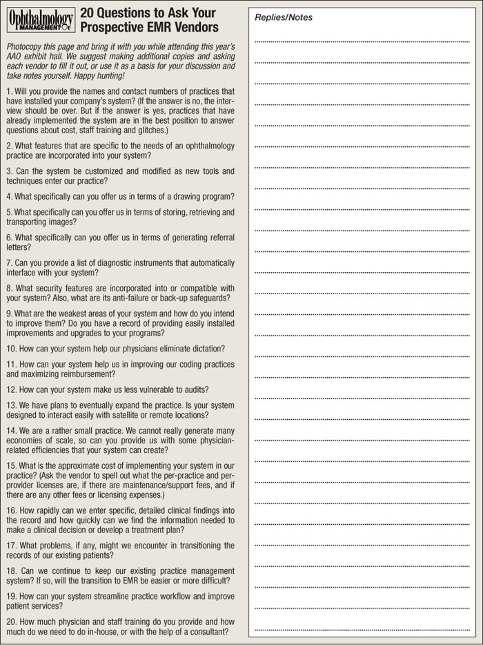 First up is a page with 20 key questions that independent consultants recommend asking of each vendor that you consider. Any EMR vendor worth its salt must be able to answer these questions in a way that satisfies the practice. Clearly, you will have many additional questions specific to your practice, but if a vendor can answer these to your satisfaction, they're probably worthy of further consideration. We recommend you bring a copy of this questionnaire to each vendor and use it to guide your discussion.