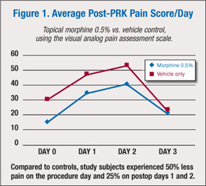 We conducted a prospective randomized placebo-controlled study of the effect of topical 0.5% morphine on pain control after PRK. Twenty patients were randomized to topical morphine and another 20 to a vehicle-only control group. All patients administered the drops four times per day for the first four days — until the epithelial defect healed and the bandage contact lens was removed.