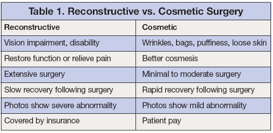 Cosmetic surgery is performed to improve appearance while reconstructive surgery is performed to restore or improve function, although incidental improvement in appearance may also occur. This month we will continue to address this issue and examine some of the implications for lower eyelid surgery.