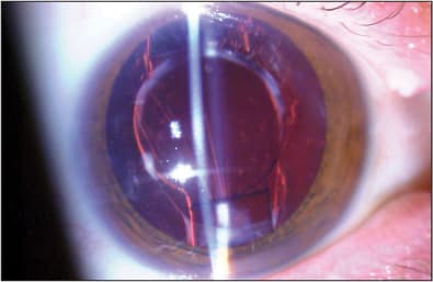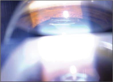 This is a 50-year-old biomedical engineer who presented with bilateral Z syndrome after cataract surgery with Crystalens done elsewhere one year earlier. He is a very high myope with long, 29.8-mm eyes who received 6 D implants. In both eyes, I saw severe fibrosis, posterior capsule haze and a Z syndrome (Figures 1 and 2) with the lens pushed forward to the point that it was actually anterior the pupil plane on gonioscopy (Figure 3). The Z syndrome had induced significant myopia and astigmatism and the capsular haze limited BCVA to 20/60 OD and 20/100 OS.