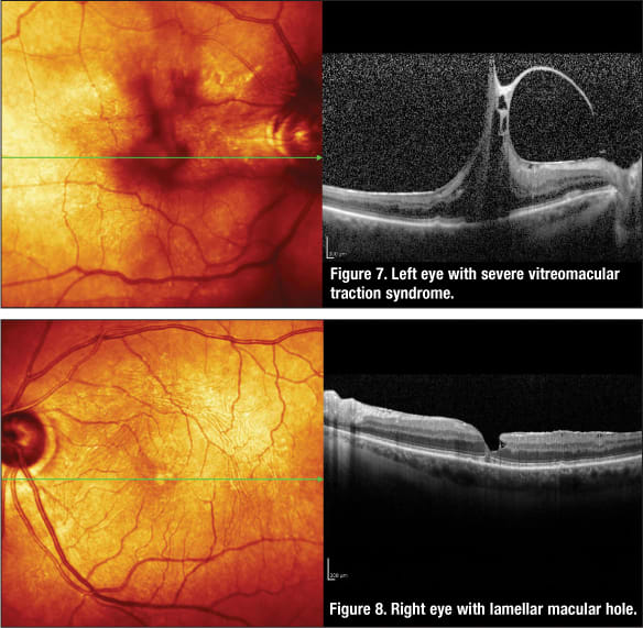 The patient assured me that he saw perfectly out of the left eye as recently as a year ago. I decided to attempt an OCT evaluation, which revealed a lamellar macular hole in the right eye and a severe vitreomacular traction syndrome in the left eye (Figures 7 and 8). The patient was referred for vitreo-retinal surgery in the left eye, which was performed successfully, and cataract surgery followed in both eyes, leading to 20/30 vision in the OD and 20/50 in the OS.