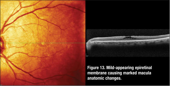 In other cases, however, a relatively mild-appearing membrane can be associated with severe macular thickening or even maculaschisis-type changes (Figure 13) that make for a more guarded visual prognosis. In cases such as this with a mild cataract, we may defer surgery or consider treating the retina first.