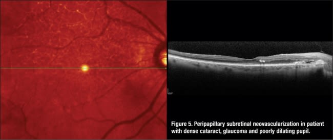 Although I could not see her retina clearly, I was able to obtain an excellent image with the SD-OCT through the cataract that demonstrated fluid in the macula from a peripapillary disciform lesion (Figure 5). In this case, prior to performing cataract surgery I referred her to a retina colleague who did an anti-VEGF injection and laser treatment of this leaking area, resolving the problem completely. She then underwent successful cataract/glaucoma surgery with a 20/20 visual outcome.