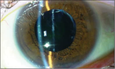 Figure 9. Lamellar hole presenting after Crystalens surgery in left eye.