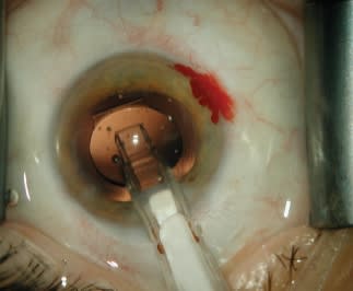 Figure 1. Dr. Weinstock implants a Crystalens IOL, placing the tip of the injector far and deep into the capsular bag. When the bag is filled with viscoelastic, the leading haptics fold, bend and slide safely into place.