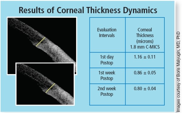 Figure 1. In Dr. Malyugin's study, as measured by anterior segment OCT, corneal thickness returns to its initial state quickly following 1.8-mm C-MICS.